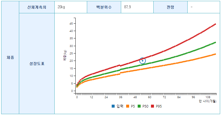 물론 앞으로 식사하는 영양상태나 습관, 운동여부에 따라 그 값이 달라질 수 있겠지만 대략적인 성장수준을 가늠해 볼 수 있습니다. 더불어 체중은 또래 대비 87.9 라는 수치를 보이는데요, 또래 아이들보다 몸무게가 좀 더 나가고 덩치있어 보인다는 결과를 얻을수 있겠지요.