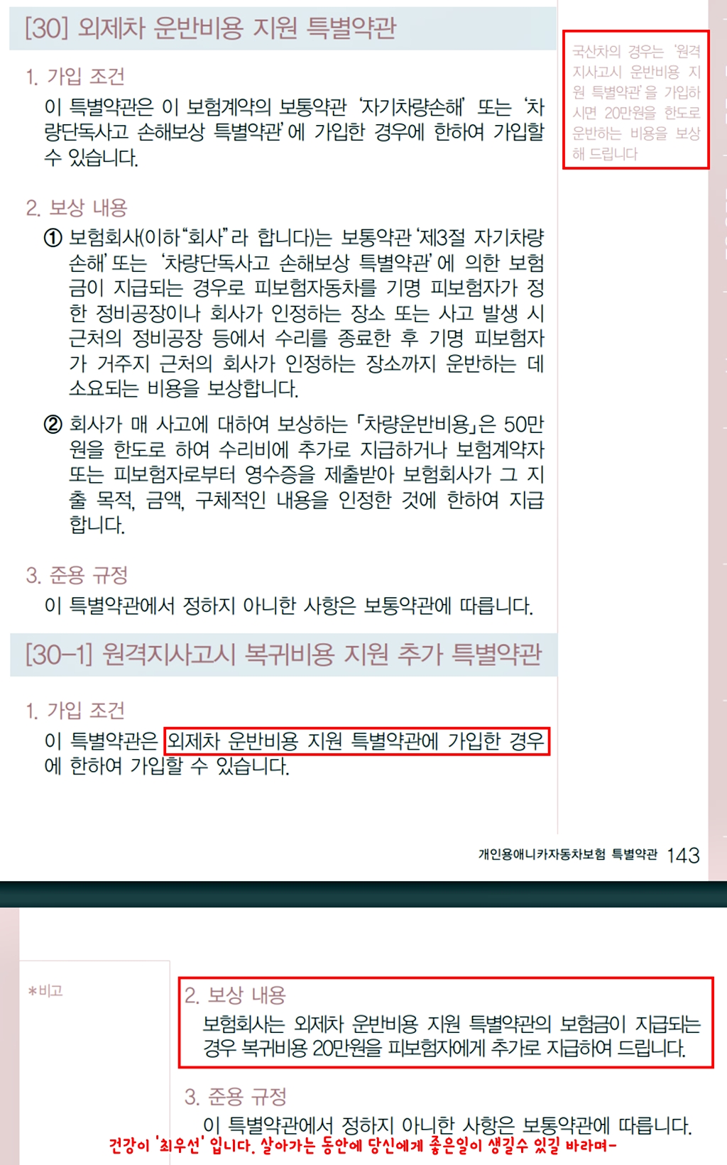 그 외에도 삼성화재의 경우에는 자동차보험 특약 중 원격지운반특약 이라는 내용이 있는데 이런 특약을 가입했다면 멀리서 사고가 났을 때 그 견인 비용에 대해 20만 원을 보상받을 수 있습니다. 대략 40km 정도 견인한다면 그 금액이 20만 원 정도 나올 수 있는데요, 자동차보험에서 견인 50km 확대 특약(자동차보험에서 대략 2만 원 추가)을 사용하고 원격지 운반 특약을 사용한다면 90km까지는 내가 추가로 내는 돈 없이 1년 10회 정도는 부담 없이 사용할 수 있습니다.(물론 보험료를 3만 원 정도 더 내니 무료는 아니지만 그 금액이 약소하니 거의 부담 없다고 생각하시면 좋겠습니다.)