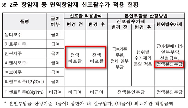 하지만 반대로 건강한 직장인들을 보자면 본인들은 아무런 혜택도 받지 못하고 비싼 의료보험료를 내면서, 본인과는 전혀 상관없는 사람들에게 큰 비용의 약값을 무작위로 지급한다는건 이해하지 못할 일일 수도 있습니다. 또한 신포괄수가제 폐지 없이 적용된다면 기존 치료자는 혜택을 받고, 신규 치료자는 소외되는 현상도 생겨납니다. 고가의 암 치료는 정부가 모든 부분을 다 지원해줄 수 없습니다. 개인적인 암 대비 민영보험을 통해 기본적인 준비는 하는 것이 좋겠습니다.
