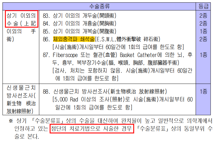 1-3종의 경우 현재는 아주 간단한 방식으로 진행되는 체외충격파쇄석술도 2종에 해당하도록 구성되어 있습니다. 쇄석술의 경우 1-5종, 1-7종, 1-8종에서는 1종으로 분류하여 지급하기도 합니다. 1-3종에서 약간 변형되어 1-5종으로 바뀌었고, 이 형태로 한동안 지속되다가 지금은 1-7, 1-8종 등으로 더 세분화되어 변경되었습니다.